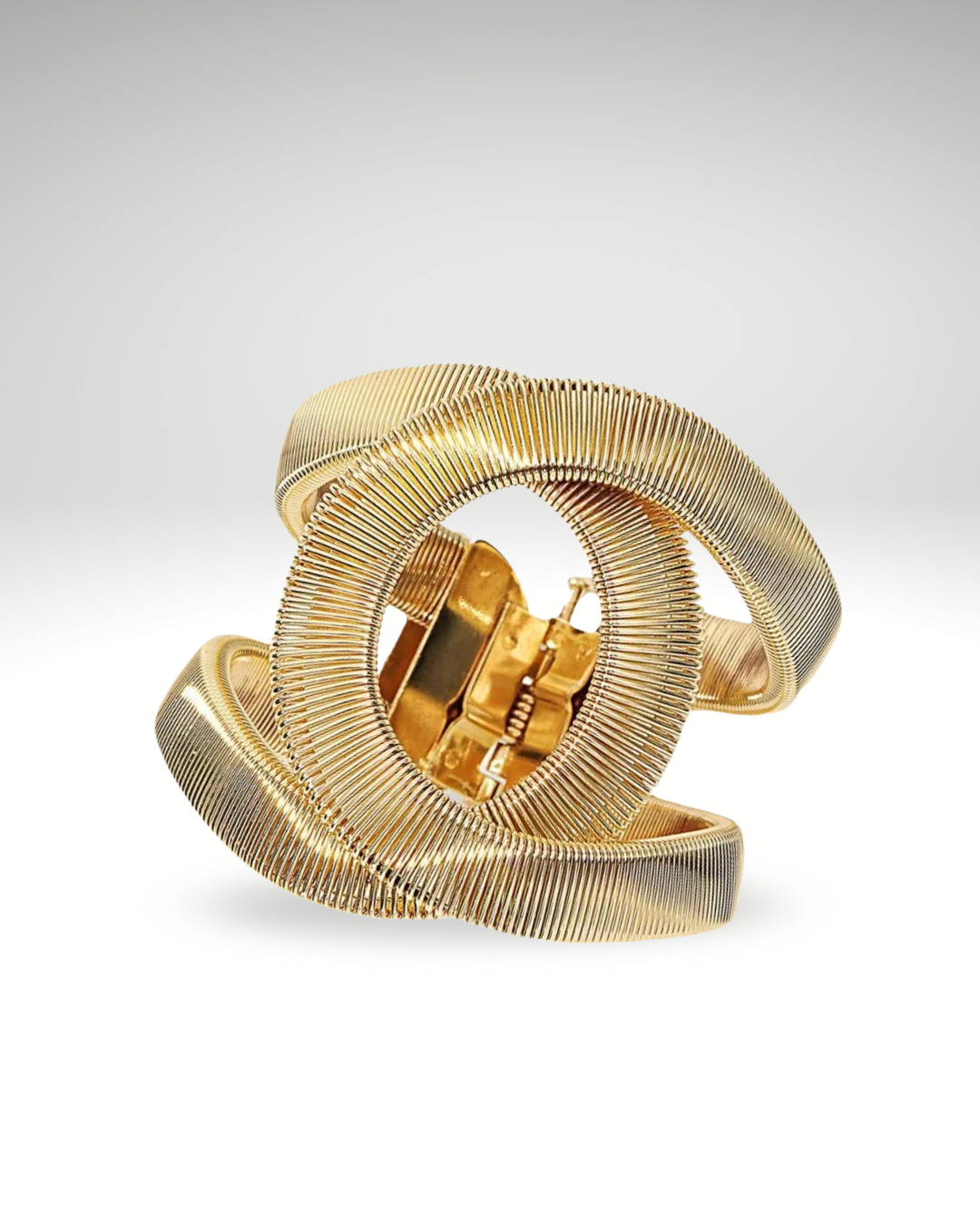 Ce bracelet à ressort torsadé est une véritable pièce maîtresse : avec ses deux anneaux texturés effet or satiné qui s'entrelacent élégamment autour du poignet, il attire tous les regards. Léger, confortable et ultra tendance, il s'adapte facilement grâce à son système d'ouverture ajustable.