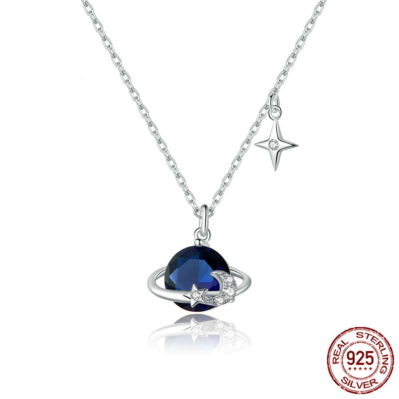 Laisse-toi emporter par la beauté de l’univers avec ce collier en argent 925 orné d’un cristal bleu profond, comme une planète suspendue dans son orbite. Son anneau étoilé et sa petite étoile sur la chaîne font de ce bijou une ode élégante à la galaxie.